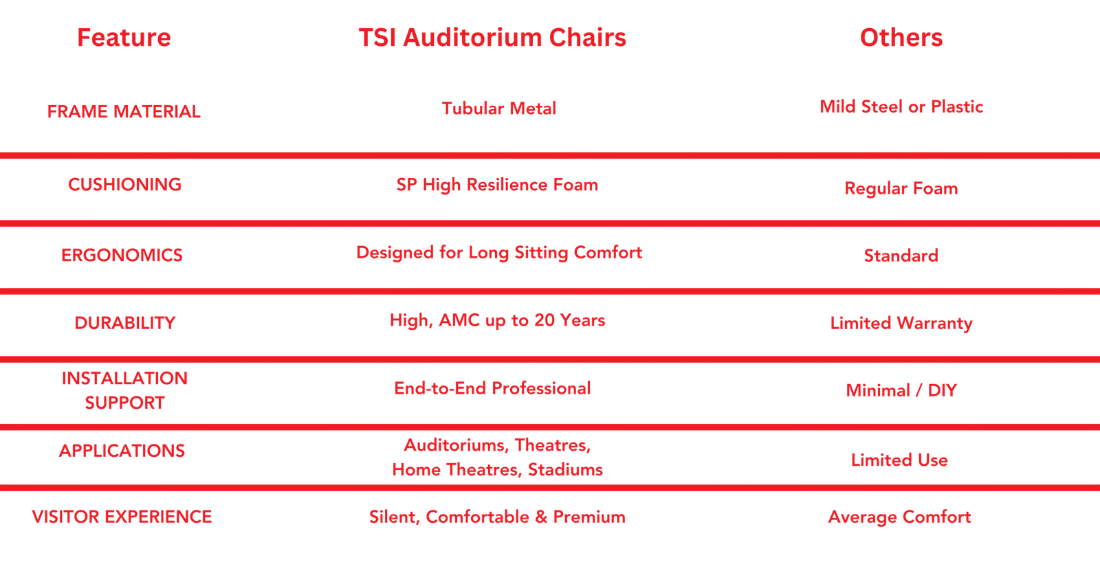 Providing the best experience to people visiting large gathering spaces like auditoriums, stadiums, or theatres starts with a seating solution. Explore a great range of seating solutions from TSI made to suit every kind of place such as Cinema Theatre, Home theatres, Multiplex, Auditoriums, Town halls, Performing Art Centers, Stadiums and Conference Rooms.
