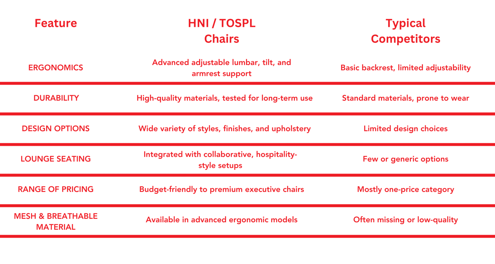 We provide ergonomic office chairs, HNI seating, lounge seating, TOSPL in-house chairs, and premium sofas designed for comfort and productivity.